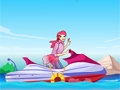 Помоги барби управлять водным мотоциклом. Твоя задача ехать и собирать подарки, подлетая на водных трамплинах, старайся держать баланс, чтоб скутер не перевернулся